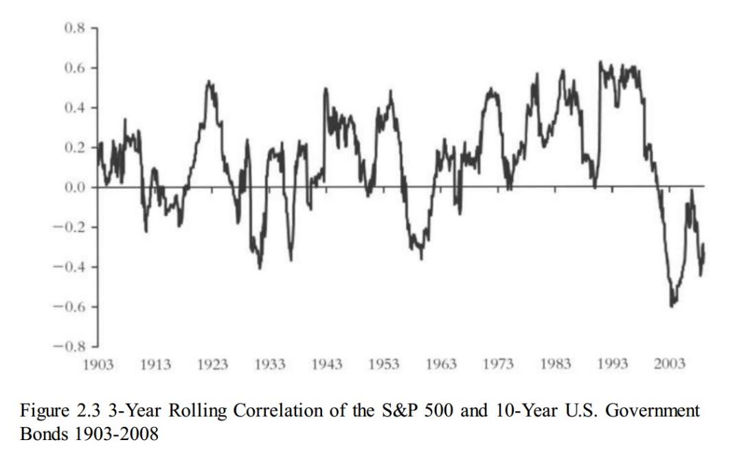 3. 从逻辑上讲,作者给出的5类资产的等比例资产组合,有点把复杂问题简单化了。就拿最简单的股债比例来说,从数据上看,10年期美股国债和标普500在1903年到2008年期间的相关性,大约在-0.60和+0.60之间波动。作者的Ivy Portfolio把股债比例分别固定在20%,显然不能很好对冲系统性风险。