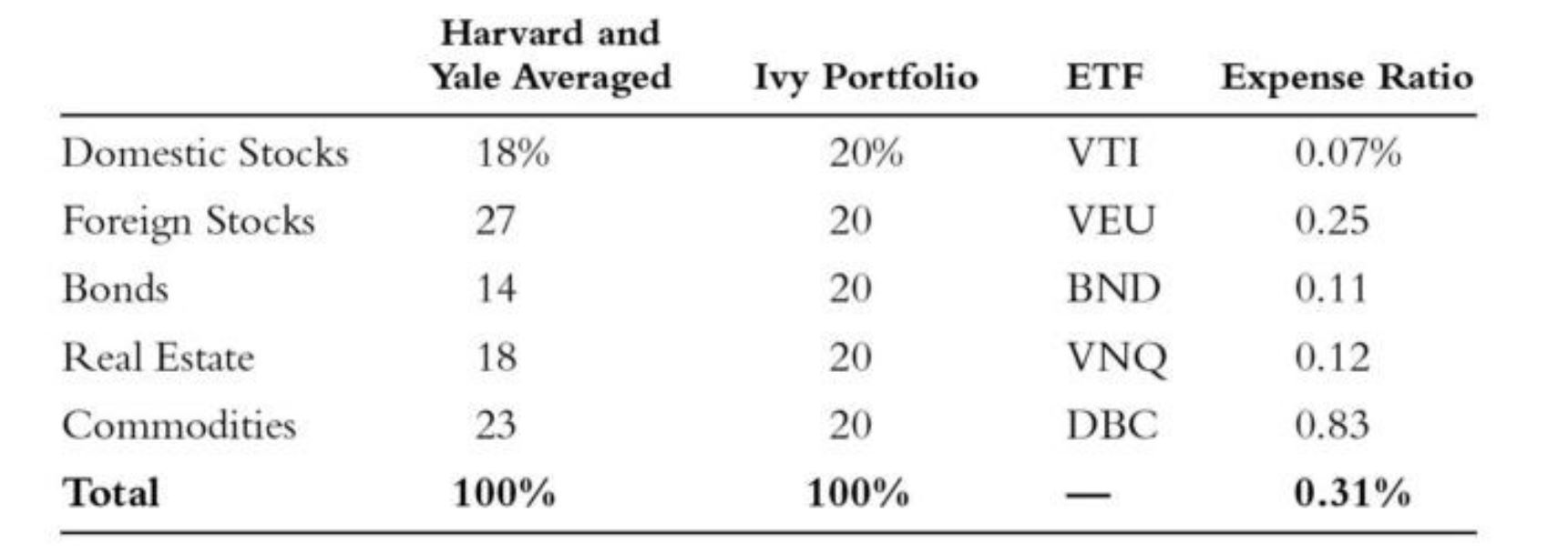 上面Yale Endowment最新的资产配置,个人投资者不太容易配置的资产有Absolute Return,Leveraged Buyouts,Natural Resources和Venture Captial。作者认为这些不能投就不投了,我们可以用能投的资产大类,构建出一个组合。最终作者给出了一个模仿Yale Endowment和Harvard Endowment的Ivy Portfolio。配置如下: