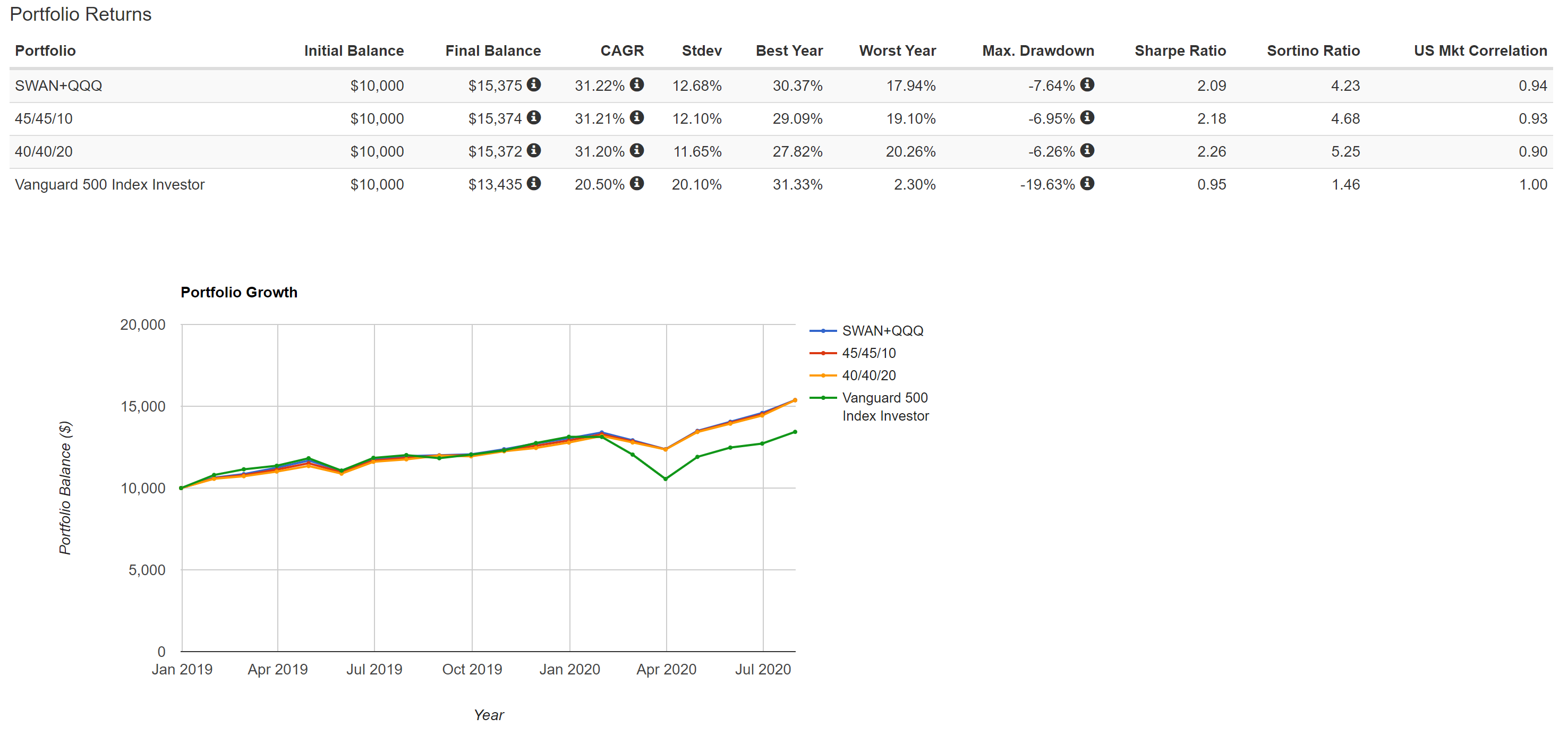 为了降低Portfolio和美股的相关性,我尝试把黄金加入Portfolio,45%SWAN + 45%QQQ + 10%GLD / 40%SWAN + 40%QQQ + 20%GLD,semi-annually rebalance,回测如下。