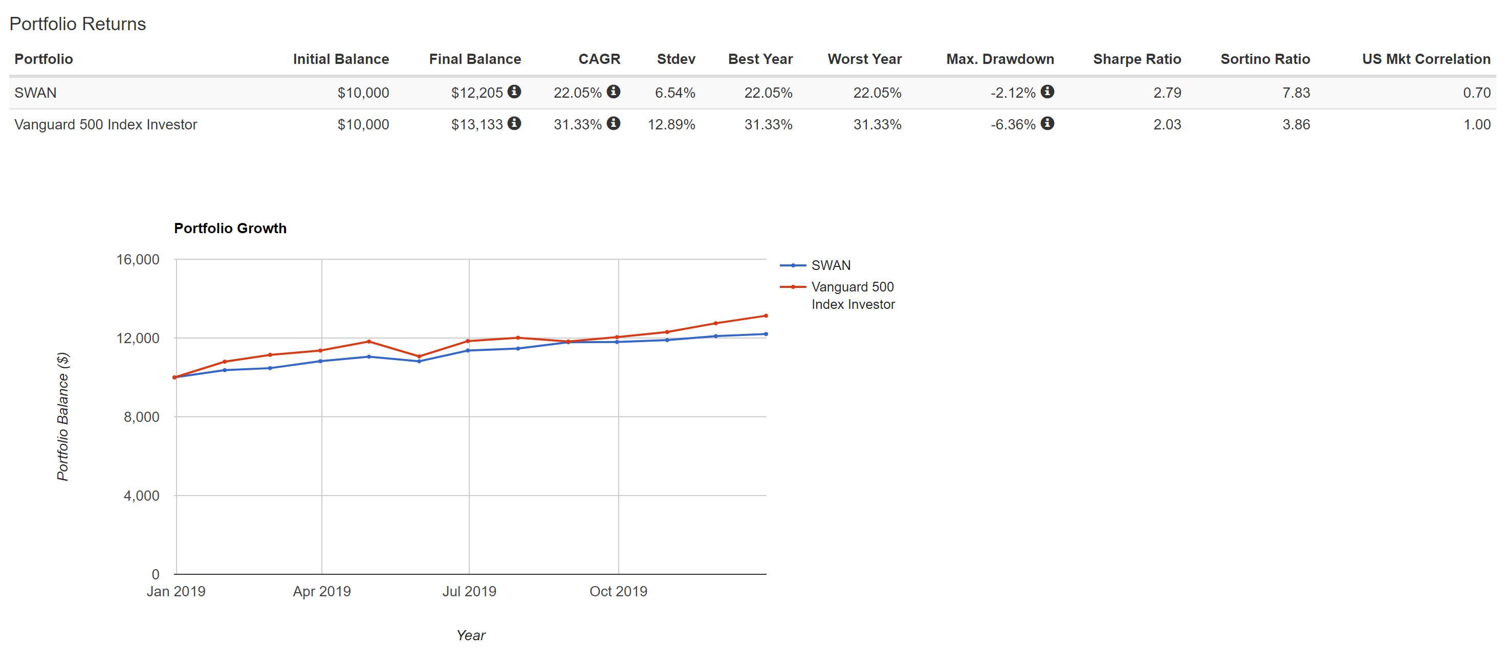 从2019年的回测数据看,SWAN获取了2019年标普500指数70.38%的收益,但是波动率只有标普500指数的50.74%,所以从夏普比率来看,SWAN承担单位风险获取的超额收益更大。
