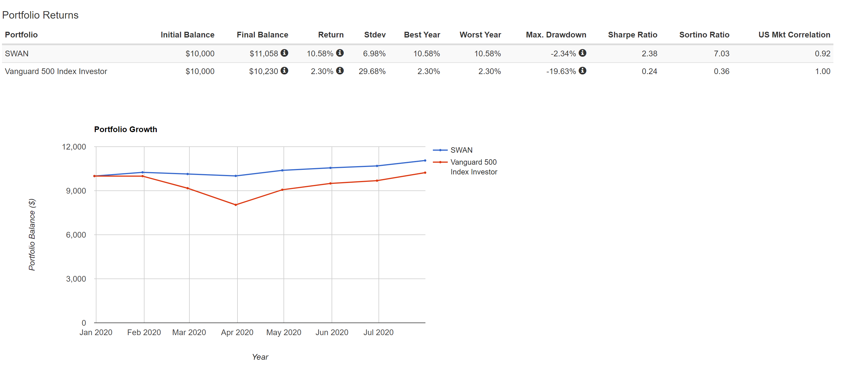 随后我看了一下回测,这个ETF成立于2018年11月,我选取了2019年和2020年至今,这两个区间。2019年这个区间可以检验SWAN的进攻性,看看时候是否能在标普500指数上涨的情况下,获取指数收益。2020年至今这个区间可以检测防守性,看下SWAN在上半年股市熔断大跌情形下的表现。